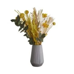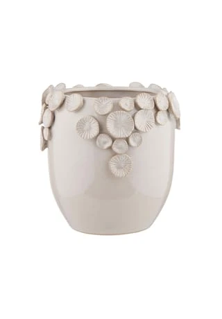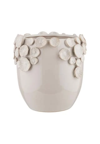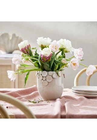 Es war einmal eine Vase, die sehnte sich nach einem Blumenkranz, und als Happy End entstand die beige Fiore Keramik Vase mit aufgesetzten Blüten in 3D. Mit dieser dekorativen Vase bringen Sie gleich zweifachen Blumenschmuck auf den gedeckten Tisch oder in Ihr liebevoll ausgestattetes Zuhause.