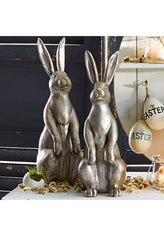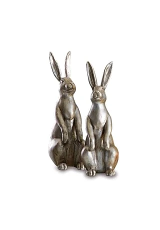 Zwei neugierig schauende Häschen verkünden mit gespitzten Ohren, dass Ostern vor der Türe steht. Nun heißt es: Dekorieren, Eier bemalen, Freunde und Familie zum Oster-Brunch einladen und gemeinsam die ersten frühlingshaften Momente des Jahres genießen. Mit diesem zauberhaften Duo kommt ganz gewiss österliche Stimmung auf. Die detailverliebte Verarbeitung gibt den beiden geradezu etwas Lebendiges. Das schöne Antiksilber-Finish rundet das Design wunderbar ab. Dank der zeitlos schönen Optik passen die Hoppelhasen zu vielen Einrichtungsstilen, etwa dem Landhaus-Stil oder dem Country-Chic. Ob auf der Kaminkonsole, auf dem Fenstersims oder unter dem bunt geschmückten Osterstrauß auf dem Tisch – dieses liebreizende Osterglück im Doppelpack bringt gute Laune in Ihre vier Wände.