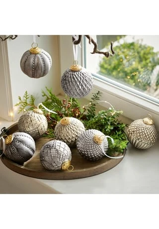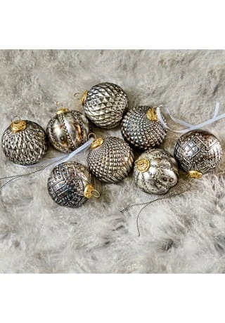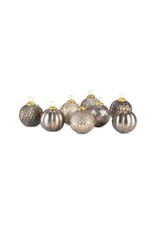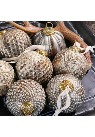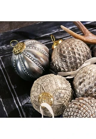 Einzigartiges Burned-Finish. Die Kugeln weisen unterschiedliche Prägungen und Muster auf. Mit hübschen Metallösen zum Aufhängen. Diese wundervollen Schmuckstücke machen den Weihnachtsbaum zum Hingucker. Das Finish gibt den Kugeln einen charmanten Vintage-Touch. Aus mundgeblasenem Glas.
