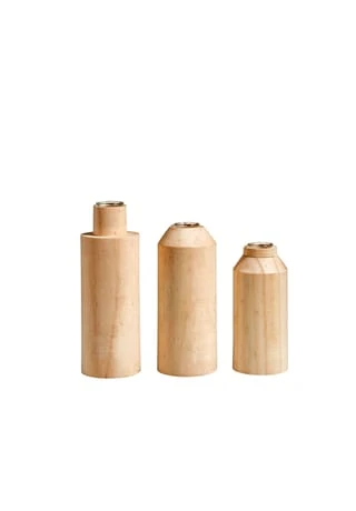 Das Set beinhaltet drei kleine Tisch-Vasen im skandinavischen Stil. Jede Vase ist anders gestaltet und besteht aus einem Korpus aus Kiefernholz, in den ein Reagenzglas eingesetzt ist.